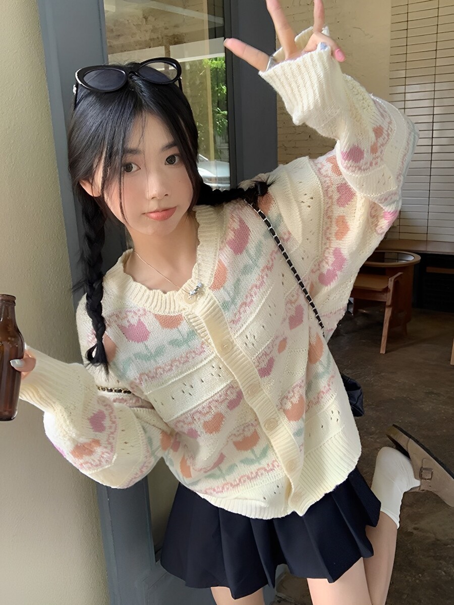 เสื้อกันหนาว เสื้อคลุม ไหมพรมแขนยาว ทรงคอกลม น่ารักม้าก ลายดอกไม้ รุ่น คลุมกระดุมลีลา i-100