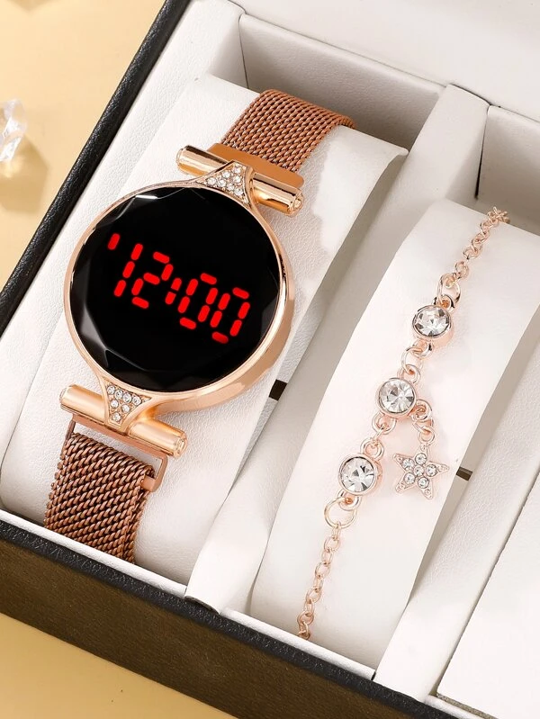 นาฬิกาข้อมือ ดิจิทัล ติดแม่เหล็ก สายผ้าโปร่ง ทรงกลม และ สร้อยคอ 1 ชิ้น น-0150