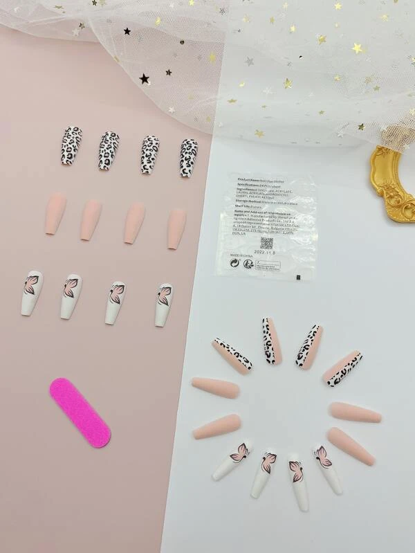 เล็บปลอม ยาว คอฟฟิน ลาย ผีเสื้อ & เทปกาว 1 แผ่น & ตะไบเล็บ 1 ชิ้น 24 ชิ้น c-87
