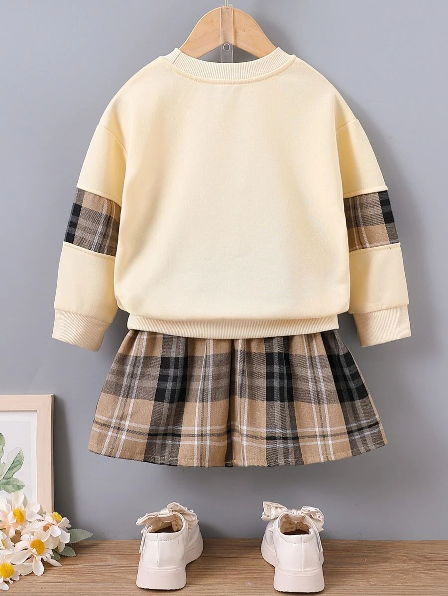 เด็กผู้หญิง เสื้อสเวตเตอร์ แพทช์ หมี เย็บลายสก๊อต & กระโปรง a-37