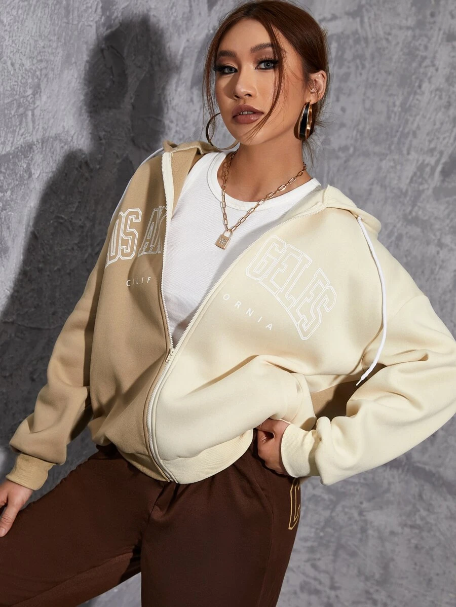 ฮู้ดดี้ ภาพกราฟิกตัวอักษร บล็อคสี ไหล่ตก ความร้อน สายรัด cc-95