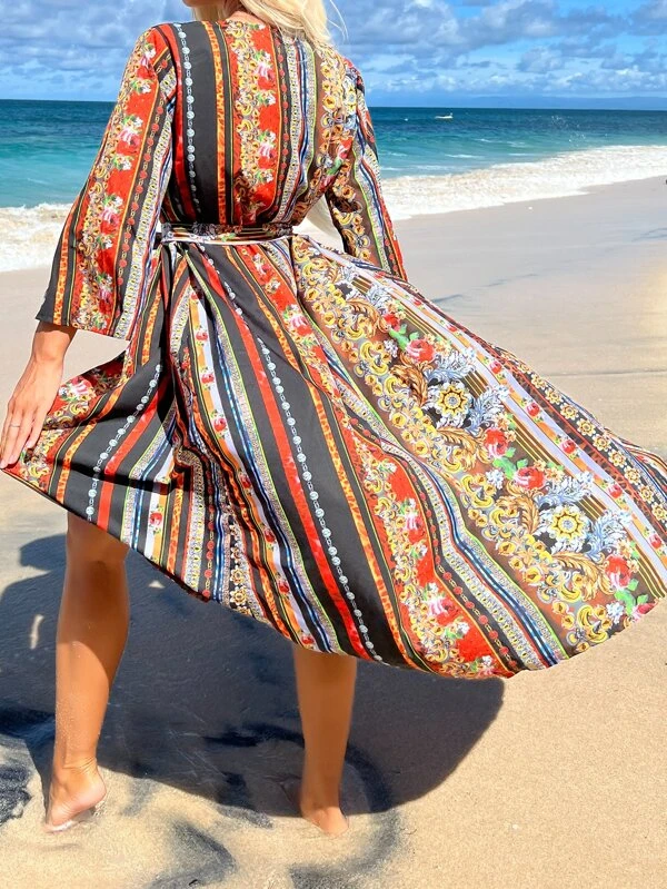 กิโมโน ลายทาง & พิมพ์ลาย ดอกไม้ แต่งเข็มขัด mm-216