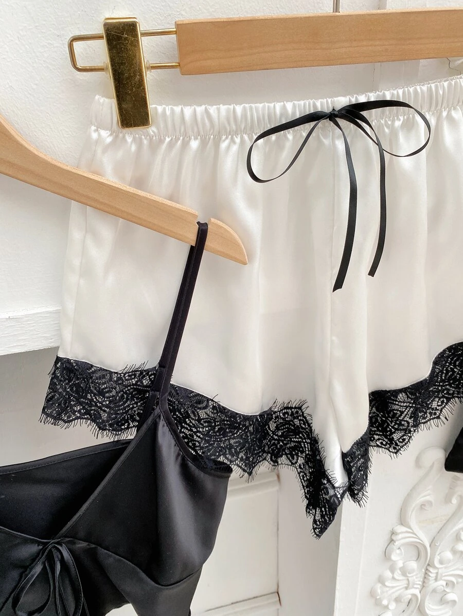 เซ็ตชุดนอน ตกแต่งด้วยแผงตาข่ายลูกไม้โครเชต์ สองสีตัดกัน ผูกโบว์หน้า เข็มขัด ผ้าซาติน 5 ชิ้น bb-73