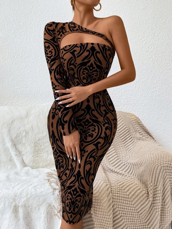 ชุดรัดรูป บอดี้คอน ลาย บาโรก ไหล่ข้างเดียว คัตเอาท์ d-100