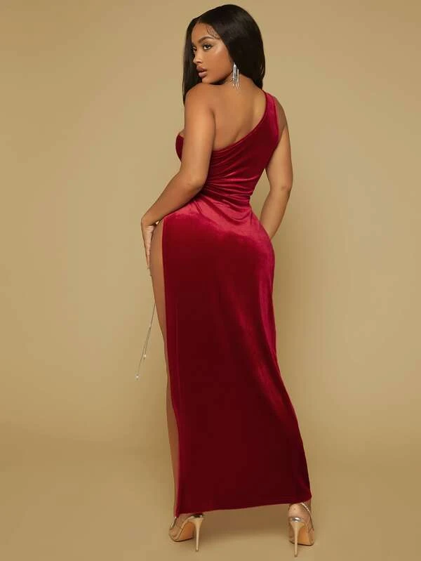 เดรส ไหล่เดียว ตัดเว้า เชือกผูก ผ่าลึก ผ้ากำมะหยี่ d-47
