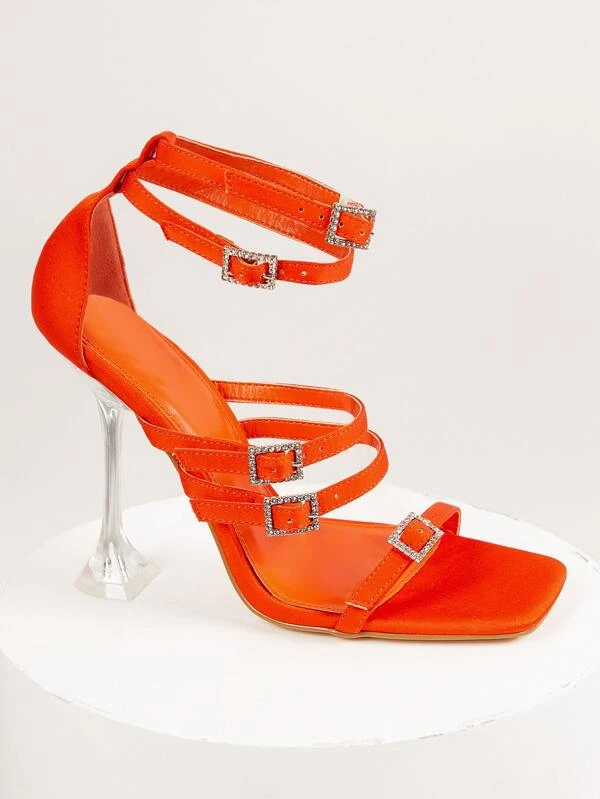 รองเท้าแตะส้นสูง โปร่งใส ทรงหัวเหลี่ยม พลอยเทียม รายละเอียด หัวเข็มขัด l-52