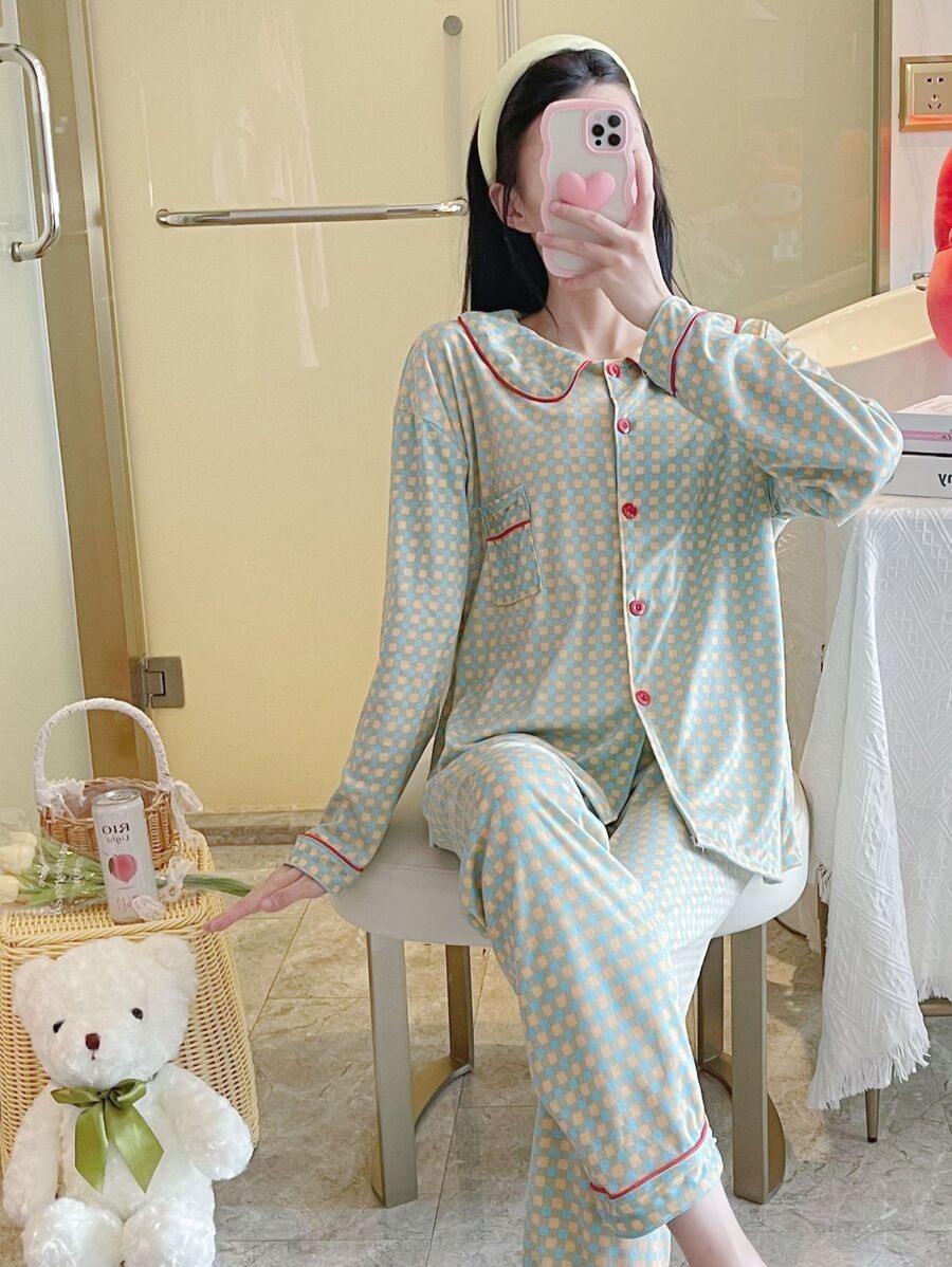เซตชุดนอนผู้หญิง ชุดนอนผู้หญิง ชุดนอนแขนยาวขายาว ผ้านุ่ม ลายสก็อต ผ้าคอตตอนผสมเรยอน