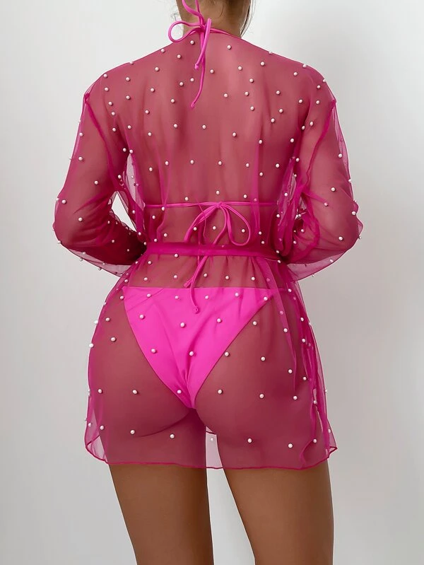 กิโมโน ลูกปัดไข่มุก ผ้าโปร่ง สายผูกเอว mm-226