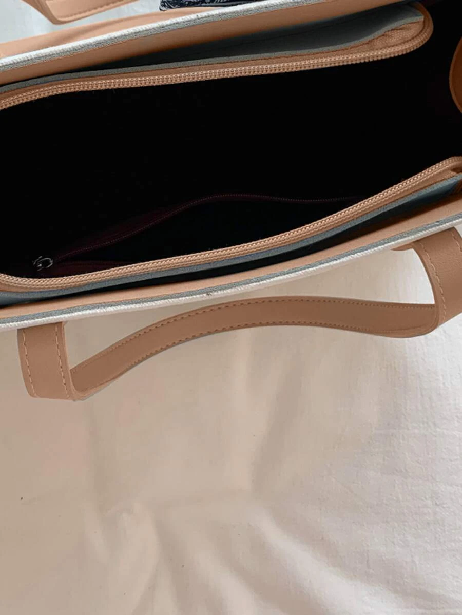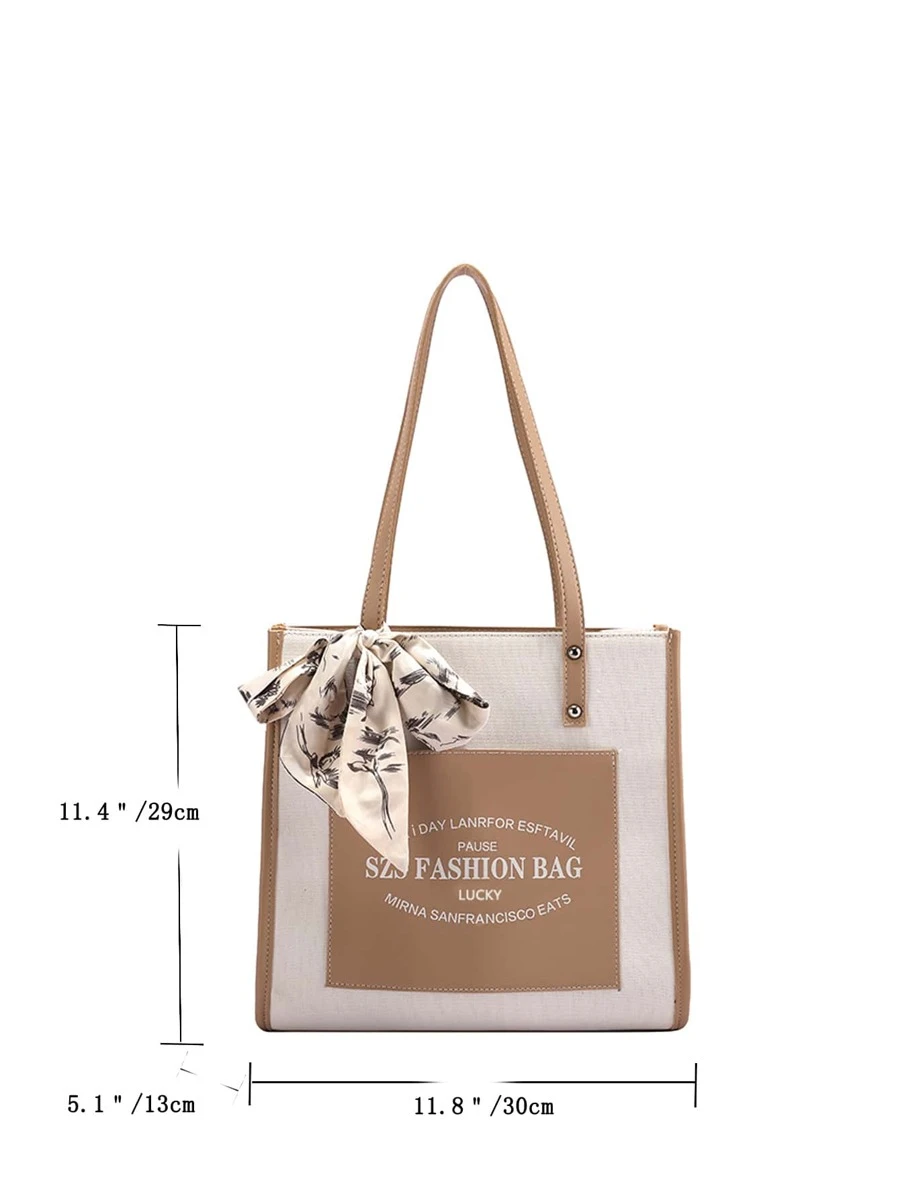 กระเป๋าโท้ท สะพายไหล่ คัลเลอร์บล็อก ลายตัวอักษร แต่งผ้าทวิลลี่ v-6