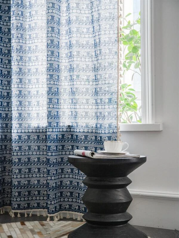 ผ้าม่าน ลายช้าง ขอบแต่งพู่ ผ187