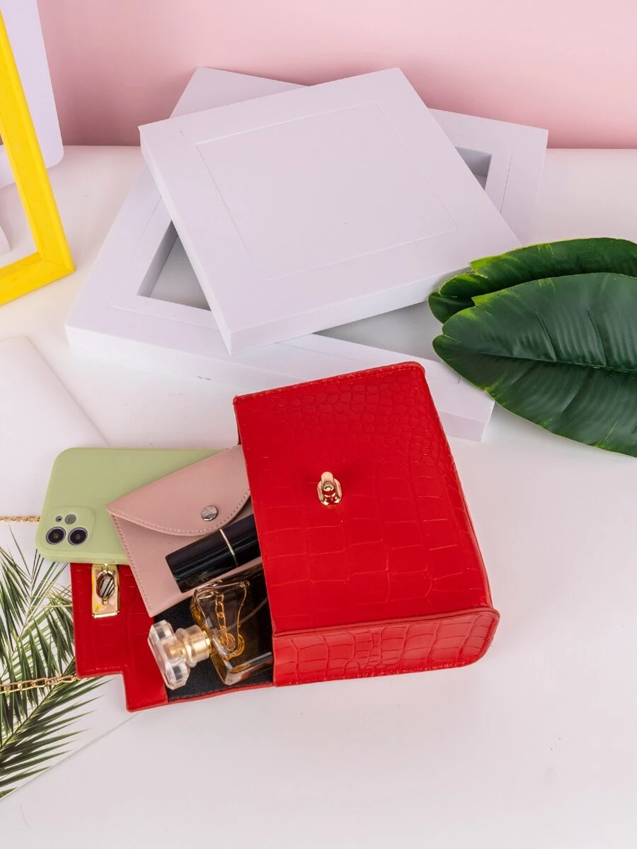 กระเป๋าสี่เหลี่ยม มินิ นีออนแดง ลายนูนจระเข้ Flap โซ่v-68