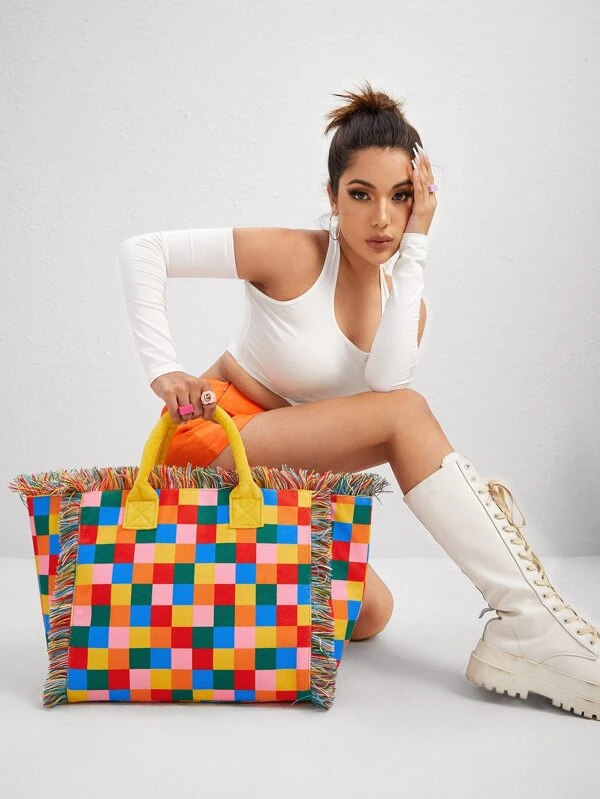กระเป๋าโท้ท ลายสก็อต แต่งฝอย b-2