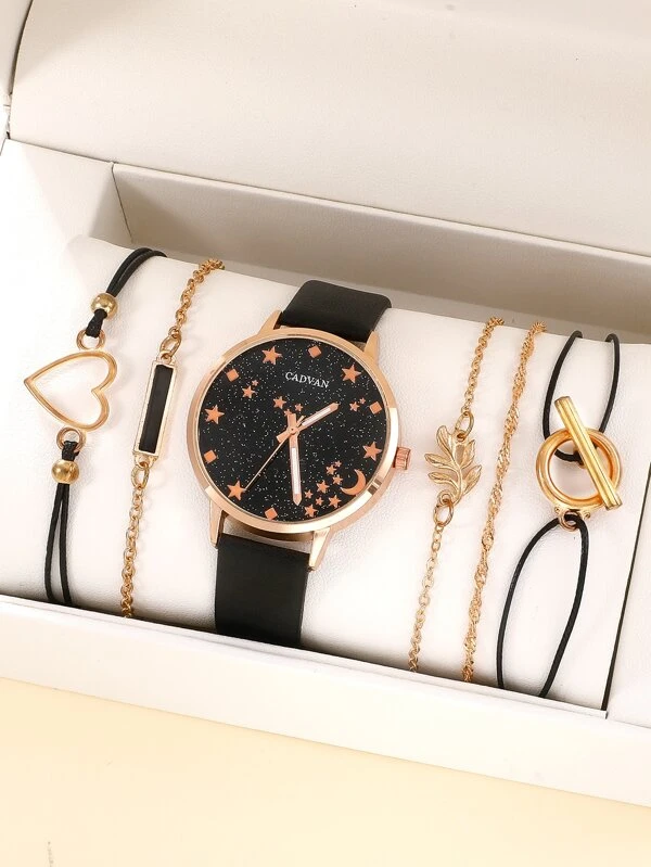 นาฬิกาข้อมือ เครื่องควอตซ์ 1 ชิ้น ลายดวงดาว และ ลายพระจันทร์ หน้าปัดกลม และ สร้อยคอ 5 ชิ้น น-0164