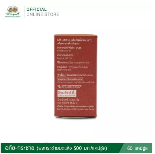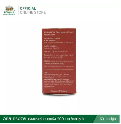 ผลิต 12/2021 หมดอายุ 12/2023 อภัย-กระชาย อภัยภูเบศร 60 แคปซูล อย. เลขที่ 11-1-18659-5-0205 ส่วนประกอบที่สำคัญ ต่อ 1 แคปซูล: ผงกระชาย 500 มก. สรรพคุณ: บำรุงร่างกาย วิธีรับประทาน: วันละ 4 แคปซูล หลังอาหาร (มื้อละ 1 แคปซูล)