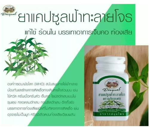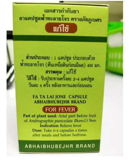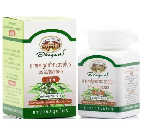 แคปซูลฟ้าทะลายโจร ตราอภัยภูเบศร 400 มก บรรจุ 60 แคปซูลฟ้าทะลายโจร Andrographis paniculata (Burm.f:)Nees สมุนไพรชนิดนี้ ทางโรงพยาบาลเจ้าพระยาอภัยภูเบศร ผู้ผลิตใช้ข้อมูลการศึกษาวิจัย จากที่มีการวิจัยไว้แล้ว ซึ่งมีข้อมูลยืนยันถึงความปลอดภัยและประสิทธิภาพ จึงได้พัฒนาให้อยู่ในรูปของแคปซูล ใช้เป็นทางเลือกในการรักษาอาการไอและเจ็บคอที่ไม่มีข้อบ่งชี้ว่าต้องใช้ยาปฏิชีวนะ,แก้ท้องเสียผู้ผลิต โรงพยาบาลเจ้าพระยาอภัยภูเบศร จ.ปราจีนบุรีส่วนประกอบ: ฟ้าทะลายโจรแห้ง สรรพคุณ: แก้ไข้วิธีใช้: สำหรับแก้ไข้ รับประทานครั้งละ 2-4 แคปซูล วันละ 4 ครั้ง หลังอาหารและก่อนนอนอายุผลิตภัณฑ์: 3 ปี (นับจากวันผลิต) ความแรง/ขนาดบรรจุ: 400 มิลลิกรัม/แคปซูล (60 แคปซูล/กระปุก)ประเภทยา: ยาสามัญประจำบ้านเลขทะเบียนที : G 512/60