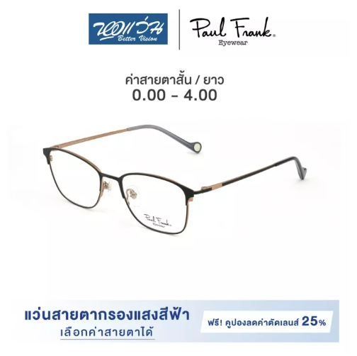 คุณสมบัติ : กรอบแว่นตา PAUL FRANK แบรนด์แว่นตาที่สะท้อนความสดใสในแบบวัยรุ่น ที่แฝงไปด้วยความขี้เล่น ผ่านนการสร้างสรรค์ที่ชาญฉลาดด้วยรูปลักษณ์ที่แตกต่าง โดดเด่นด้วยลายละเอียดสุดชิค ควบคู่ไปกับคุณสมบัติการใช้งานที่ทนทาน ผลิตจากวัสดุโลหะพรีเมี่ยม ออกแบบมาสำหรับการใช้งานในชีวิตประจำวัน เหมาะสำหรับทุกเพศทุกวัย ไม่ว่าจะวัยรุ่นหรือผู้ใหญ่