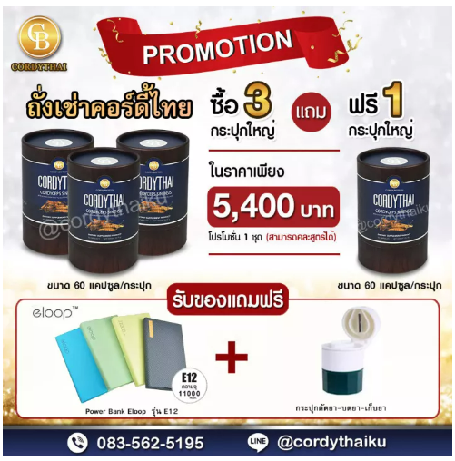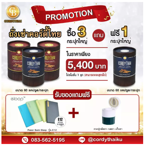 Product details of ส่งฟรี⚡ Cordythai ถั่งเช่าคอดี้ไทย สูตรใหม่ บรรจุ 60 เเคปซูล (โปร3แถม1) เลือกสูตรชาย-หญิงได้ 4 กระปุก ฟรี Power Bank E12 และ กระปุกตัดยา3in1