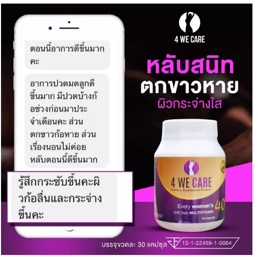 อาหารเสริมวัยทองสำหรับผู้หญิงอายุ 35 ปีขึ้นไป จำหน่ายมาแล้วกว่า 6 ปี ยืนยันโดยผู้ใช้จริงหลายหมื่นคน* บริษัทมีเภสัชกรและผู้เชี่ยวชาญให้คำแนะนำเพิ่มเติม และติดตามผลการทานอาการธรรมดา ที่ผู้หญิงเกือบทุกคนจะมี เมื่ออายุ 35 ปีขึ้นไป 1. นอนหลับยาก ตื่นกลางดึก แล้วนอนต่อไม่ได้ 2. ผิวหน้ามีฝ้า ริ้วรอย ไม่สดใส 3. ชาไปหมด ปวดเมื่อย 4. ปวดหัวบ่อย ไมเกรนขึ้น 5. ความเป็นหญิงน้อยลง เจ็บและแห้ง เจ็บแปล๊บๆที่มดลูก 6. เวียนศรีษะ ความดันต่ำ เลือดลมไม่ดี 7. หงุดหงิดง่าย จนใครๆ เรียกมนุษย์ป้า ทั้งที่จริงไม่ได้ตั้งใจหงุดหงิดเลย 8. ช่องคลอดแห้ง ผิวแพ้ง่าย คัน เกา 9. ผมร่วง เล็บหักง่าย 10. ปัสสาวะบ่อย กลั้นไม่ค่อยได้ 11. ช่องคลอดแห้ง ตกขาวอาการธรรมดาเหล่านี้ ดีขึ้นได้ เมื่อทาน 4 WE CARE.เหมาะสำหรับผู้มีปัญหาต่อไปนี้- มีปัญหาฮอร์โมนไม่สมดุล หรือเข้าสู่วัยทอง - ทำงานภายใต้สภาวะเครียด กดดัน พักผ่อนน้อย- ใช้สายตามาก หรือทำงานหน้าคอมพิวเตอร์เป็นประจำ มีปัญหาเคืองตา ตาแห้ง- ระบบภายในมีปัญหา มีกิจกรรมบนเตียงแสบขัด- พักฟื้นหลังการผ่าตัด คลอดบุตร หรือฟื้นฟูร่างกายหลังเจ็บป่วย- มีปัญหาในการนอนหลับ หลับยาก หลับไม่สนิท และอ่อนเพลียในตอนเช้า- ต้องการดูแลร่างกายเพื่อเพิ่มโอกาสในการมีบุตร- มีปัญหาภูมิแพ้- ต้องการดูแลสุขภาพองค์รวม ชะลอวัย บำรุงผิวพรรณให้เปล่งปลั่งสดใส