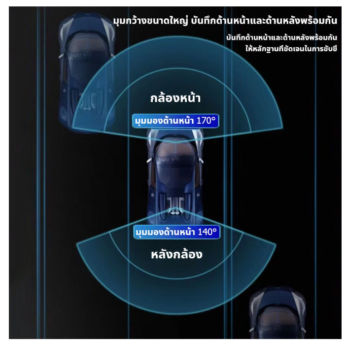 - มุมมองการบันทึกกล้องหน้า 170 องศา และกล้องหลัง 140 องศา