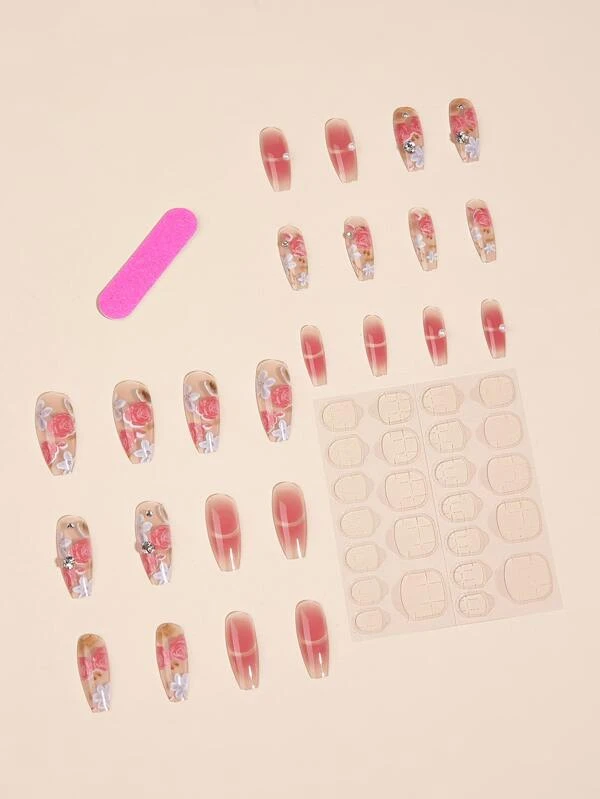 24 ชิ้น ยาว คอฟฟิน 3D ตกแต่ง พลอยเทียม เล็บปลอม & เทปกาว 1 แผ่น & ตะไบเล็บ 1 ชิ้น c-84