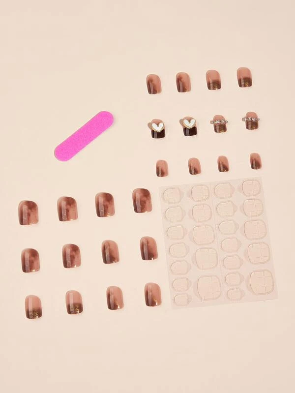 24 ชิ้น สั้น สี่เหลี่ยม 3D ตกแต่ง หัวใจ เล็บปลอม & เทปกาว 1 แผ่น & ตะไบเล็บ 1 ชิ้น c-86