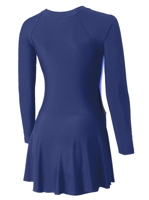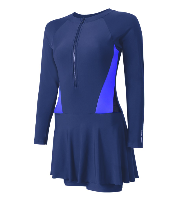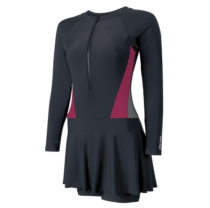- เป็นชุดว่ายน้ำ 1 ท่อน ลักษณะเป็นเสื้อแขนยาว และเป็นกางเกงกระโปรง