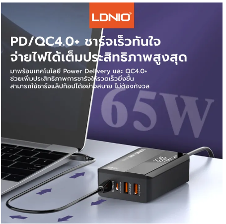- LDNIO A4808Q เป็นอแดปเตอร์ที่มีกำลังไฟสูงถึง 65W 2USB-C+2USB-A