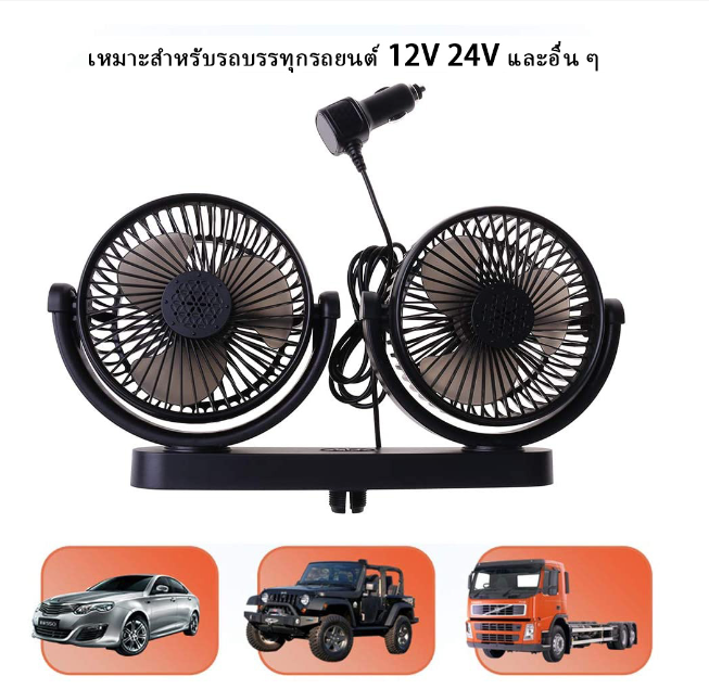 - หัวพัดลมคู่ พัดลมพกพา 12V ปรับรอบพัดลมได้ ให้ลมแรง เย็นสบาย เงียบทั้งผู้โดยสารและคนขับทันที