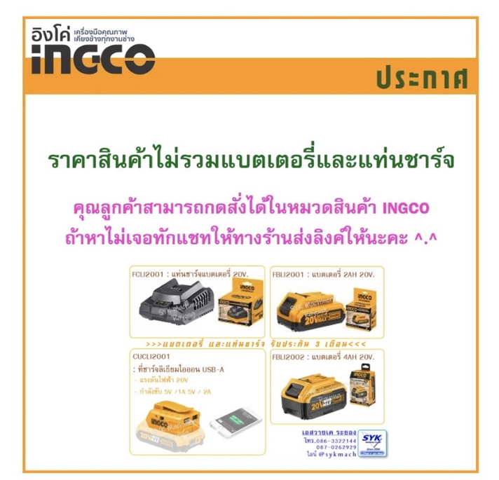 **แบตเตอรี่ และแท่นชาร์จไม่รวมในราคาเครื่อง สามารถกดสั่งได้ในหมวดสินค้า INGCO นะคะ หากหาไม่เจอทักแชทให้ทางร้านส่งลิงค์ได้เลยจรา ^.^