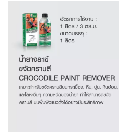 น้ำยาจระเข้ ขจัดคราบสีสำหรับขจัดคราบสีอครีลิค สีน้ำมัน สีสเปรย์ และคราบกาว บนพื้นผิวกระเบื้อง หินอ่อน ปูน โลหะ ได้อย่างมีประสิทธิภาพ น้ำยามีความหนืด ทำให้สามารถขจัดคราบบนผนังได้อย่างสะดวก
