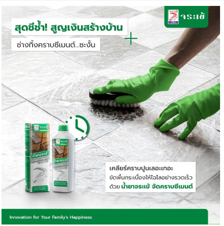 น้ำยาจระเข้ ขจัดคราบซีเมนต์น้ำยาจะทำปฏิกิริยากับคราบปูน, ยาแนว, หรือฝุ่นผงจากการก่อสร้างที่สะสมบนพื้นผิวอย่างมีประสิทธิภาพ ช่วยประหยัดเวลาในการทำความสะอาดพื้นที่ หลังการติดตั้งกระเบื้องเหมาะกับกระเบื้องที่มีสารเคลือบหน้า หรือกระเบื้องเคลือบเงาการเตรียมพื้นผิวพื้นที่ต้องการจะขจัดคราบซีเมนต์ ยาแนว ปูนกาว นั้นต้องแห้งเต็มที่อัตราส่วนผสม