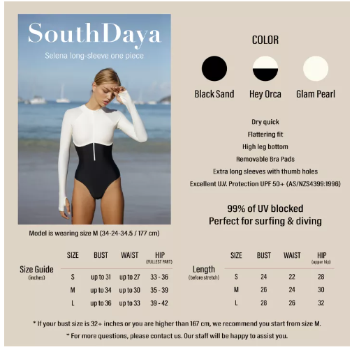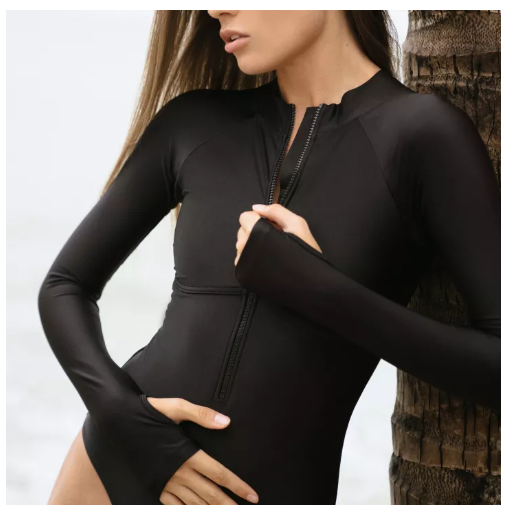 Selena Black Sand Long-Sleeve One piece Swimsuit ชุดว่ายน้ำหญิงวันพีชแขนยาว สีดำกลิตเตอร์ มีฟองน้ำถอดออกได้ ผ้ากันยูวี UPF 50+ จัดส่งฟรี
