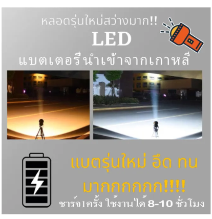 กันน้ำได้ดี ใช้ลุยฝนได้ ใช้สำหรับทำงานกลางแจ้ง จับปลา/กบ กรีดยางเดินป่า 1200 mAh แบตเตอรี่ลิเธียม วิธีการใช้งาน การชาร์จไฟ : นำอแดปเตอร์ชาร์จไฟเสียบเข้ากับปลั๊กไฟ ขณะชาร์จไฟจะขึ้นสถานะสีแดง เมื่อแบตเต็มไฟจะขึ้นสถานะสีเขียว ใช้เวลาชาร์จ 8-10 ชั่วโมง ไม่ควรถอดอแดปเตอร์หรือยกเลิกการชาร์จก่อนแบตเตอรี่เต็ม
