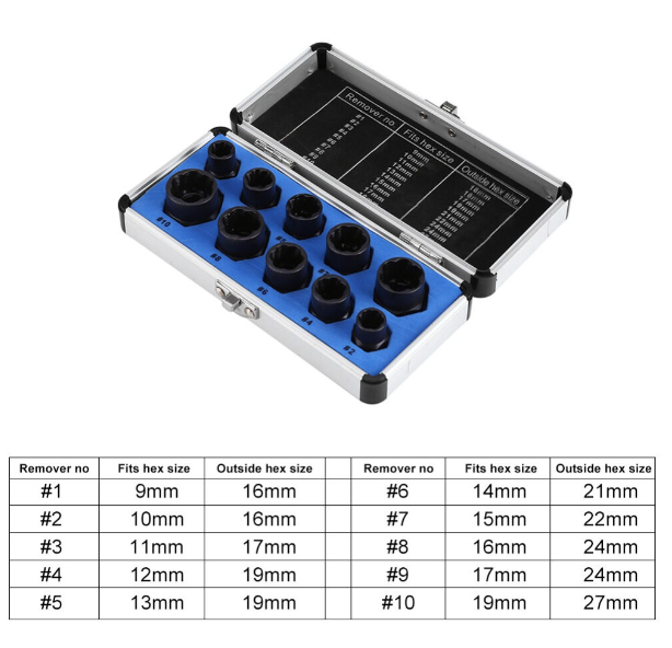 ในชุดประกอบด้วย - บล็อคถอนน็อตหัวเสียเกลียซ้าย 10 ชิ้น เบอร์ 9 ,10 ,11,12,13,14,15,16,17 และ 19 มิล - ตัวล็อคบล้อคถูกออกแบบให้เป็นเกลียว ซ้าย แบบมีเทเปอร์ มีคมสำหรับจิกน็อคที่หัวเสีย ยิ่งดันลึกยิ่งแน่น - ผลิตจากโลหะ อัลลอยคุณภาพสูง สำหรับงานหนัก งานซ่อมแซมเครื่องจักร รถยนต์ - รูในขนาด 3/8 สามารถใช้ร่วมกลับบล็อค 3/8 ได้ หรือใช้ประแจปากตาย ประแจแหวนล็อค เพื่อจับลลูกบล็อค - มาพร้อมกล่องใส่อลูมิเนียม ป้องกันลูกบล็อคหาย