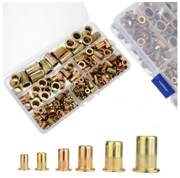 Package included (175pcs) : 45pcs x M3*9mm Rivet Nuts 45pcs x M4*11mm Rivet Nuts 35pcs x M5*13mm Rivet Nuts 20pcs x M6*15mm Rivet Nuts 15pcs x M8*18mm Rivet Nuts 15pcs x M10*21mm Rivet Nuts
