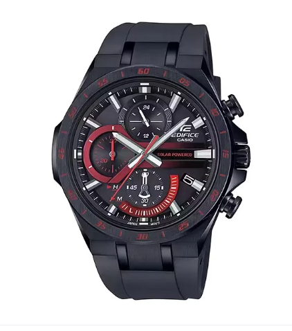 Solar Powered Chronograph | A solar-powered chronograph with a dynamic three-dimensional dial design. A full charge powers the watch for five months. The blue line accents on the dial create a sporty look.